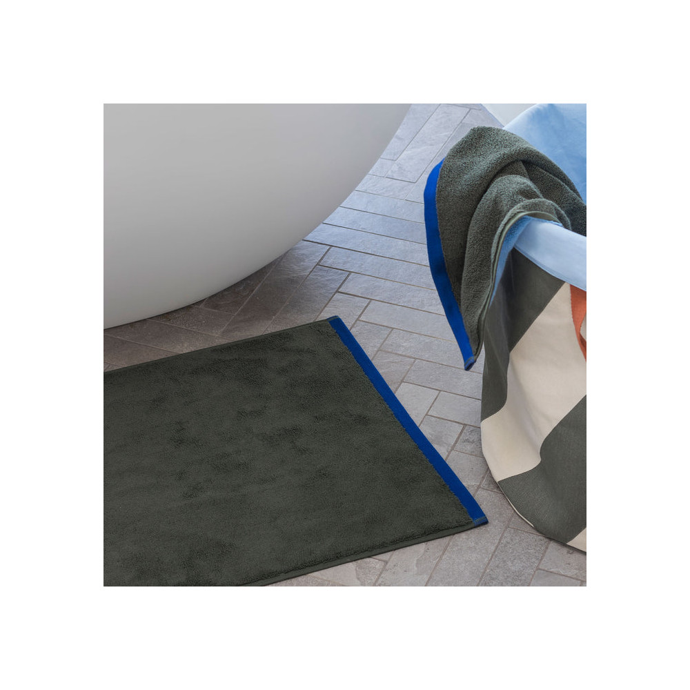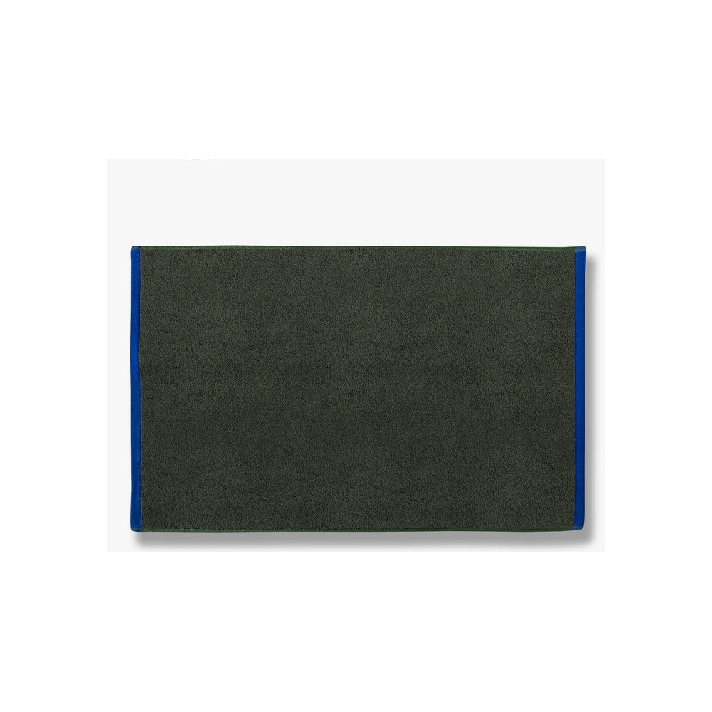 Badematten SOFT fra Mette Ditmer er vevd av kraftig, ekstra myk bomull med høy absorberingsevne og en rik, luftig struktur. Den sterke kvaliteten og det løst spunnede garnet gir en behagelig, nesten luftig overflate under føttene – ideelt etter et bad eller som en permanent del av interiøret. Matten har et dobbeltsidig design med olivengrønn på den ene siden og lyseblå på den andre.