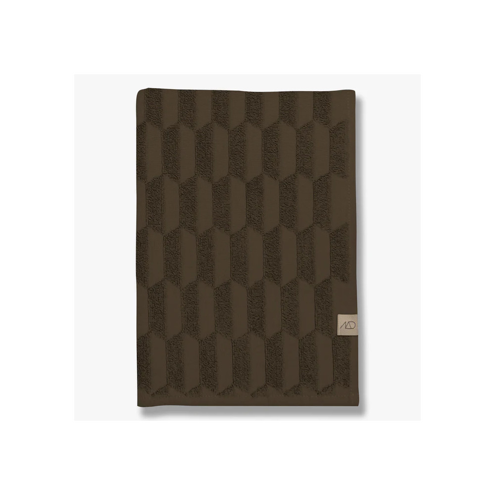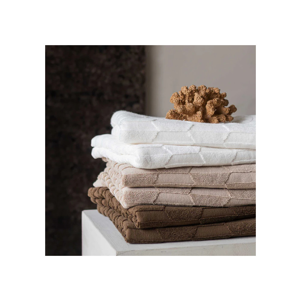 Geo-håndkleet kombinerer moderne design med hverdagskomfort. Det er vevd med en spesiell høy-lav-teknikk som skaper et elegant, tredimensjonalt mønster av sekskanter i lys og mørk kontrast. Resultatet er et håndkle som både ser eksklusivt ut og føles deilig mot huden.