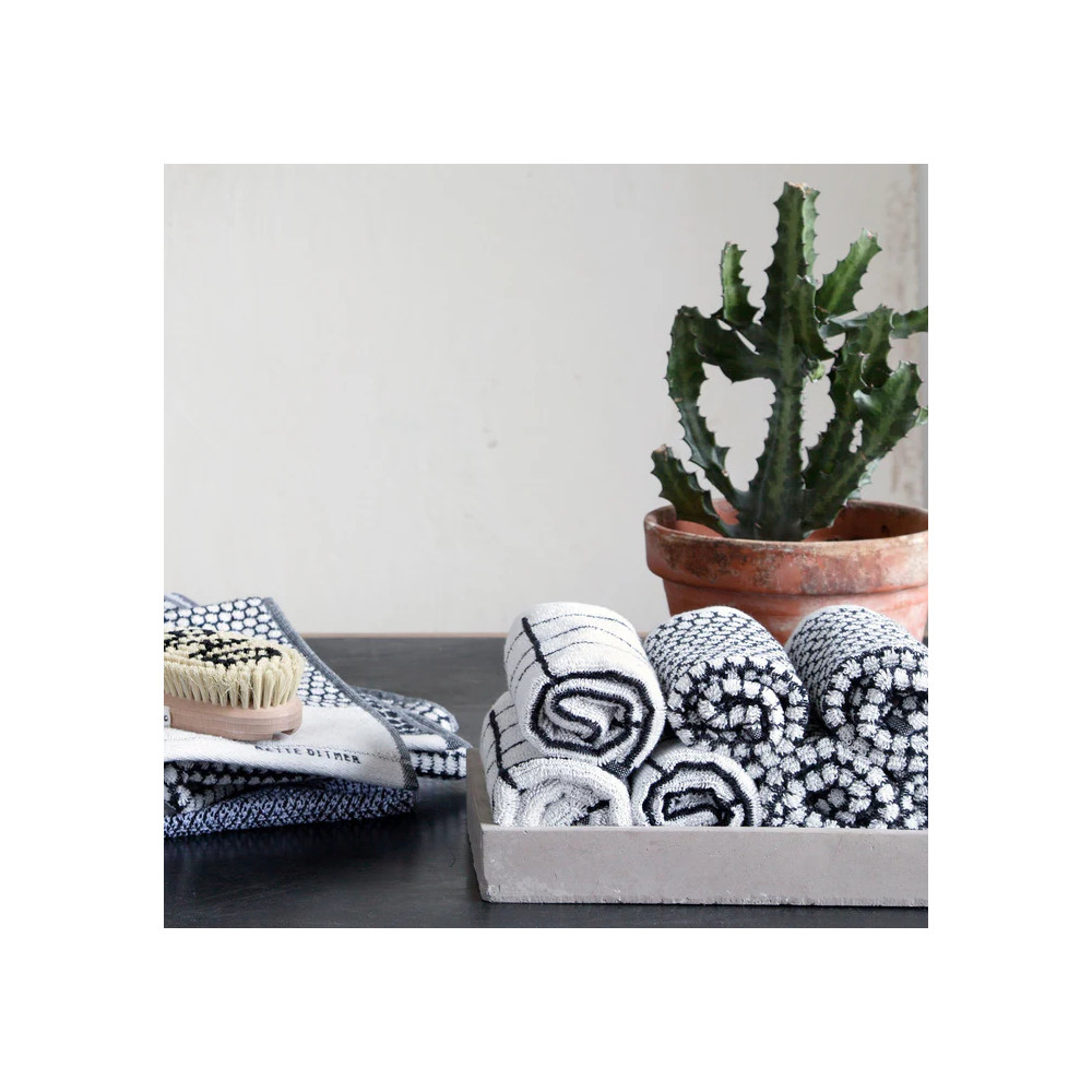 GRID-håndklærne kombinerer minimalistisk, grafisk design med en liten retro-vri, som gir badet et moderne og personlig uttrykk. Den klassiske svart/hvite kombinasjonen gjør det enkelt å matche med andre håndklær og tekstiler – for eksempel TILE STONE-serien – og skape et dynamisk og lekent uttrykk med grafiske mønstre.