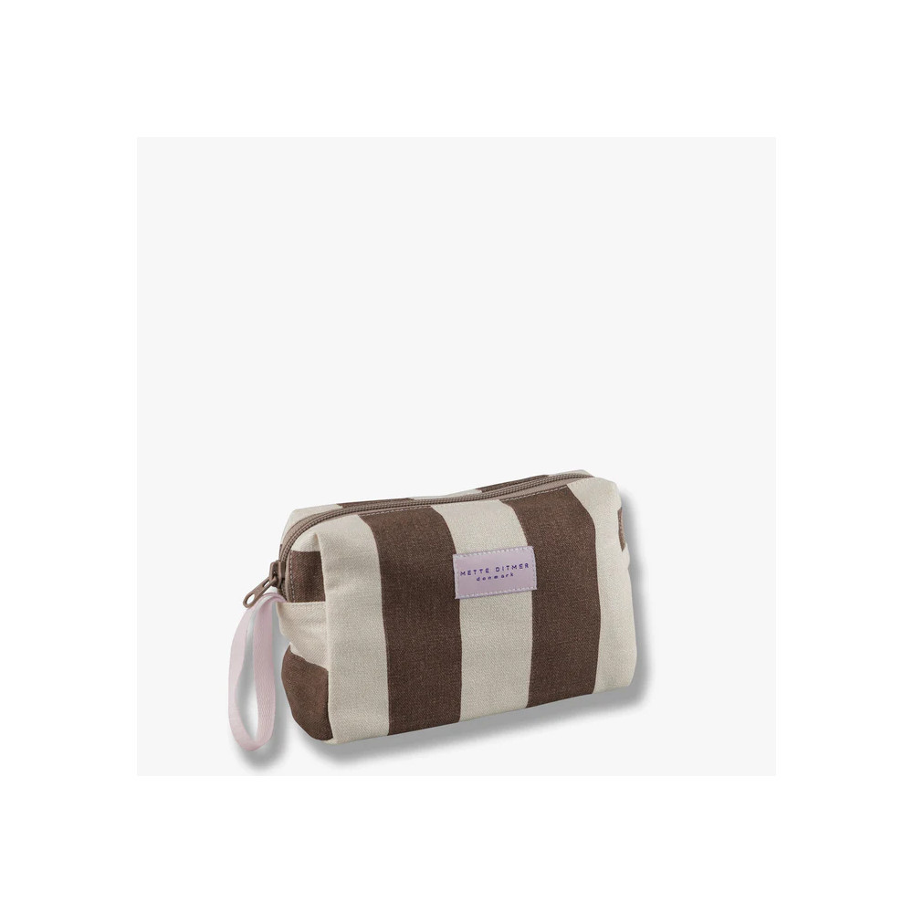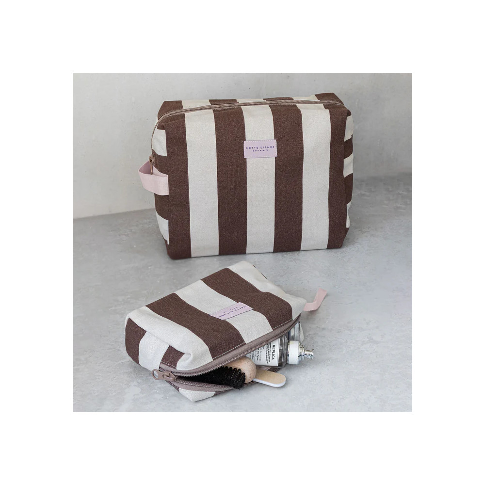 BRING-IT sminkepungen fra Mette Ditmer er ideell for bruk hjemme eller på farten. Laget av slitesterkt bomullskanvas med klassiske brune striper på en sandgrå bunn. En dempet rosa stropp og etikett for en leken kontrast. Innsiden er fôret med dempet rosa bomull og inkluderer fire praktiske lommer for å holde hårspenner, leppepomade eller tilbehør pent organisert. Fôret er behandlet med et smuss- og vannavvisende belegg for enkel rengjøring.